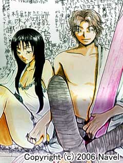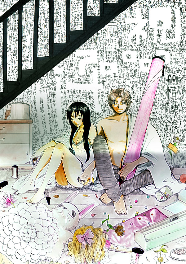 スキャナに入らないサイズのアナログ絵を二回に分けて無理やり取り込んだ結果、二人の下半身から下に影ができてしまいました。影がかかった部分は若干輪郭を見やすくフィルタ加工してあります。まあ一種の演出だと思って見てやってください。