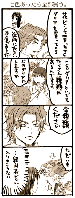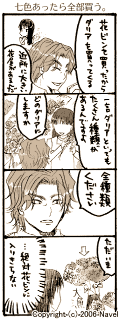 手をつなぐという仕草は下手をすると種々の誘惑の仕草よりずっと心通うというか親密なイメージがあるので、実はこの二人では絵に描いたことがなかったんですよ。ネーブルから絵をもらって初めてビジュアル化された仕草にびっくり。二人して違う方を向きながら手はこっそり繋いでいるという微妙な空気にドキドキしますね。